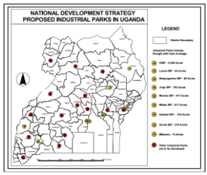 The government of Uganda aims to have 25 industrial parks around Uganda to facilitate industrial growth and output. The industrial parks program has been put in place to foster Agro-production and facilitate sustainable development in key areas of the economy.